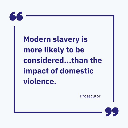Our research and experience points to the need for a comprehensive legal, policy and practice framework to protect victims of VAWG from unjust criminalisation. New statutory defences are needed, to make self-defence and duress accessible to victims of domestic abuse who are accused of offending – giving them the same protection that is already available to trafficking victims and householders facing an intruder.
